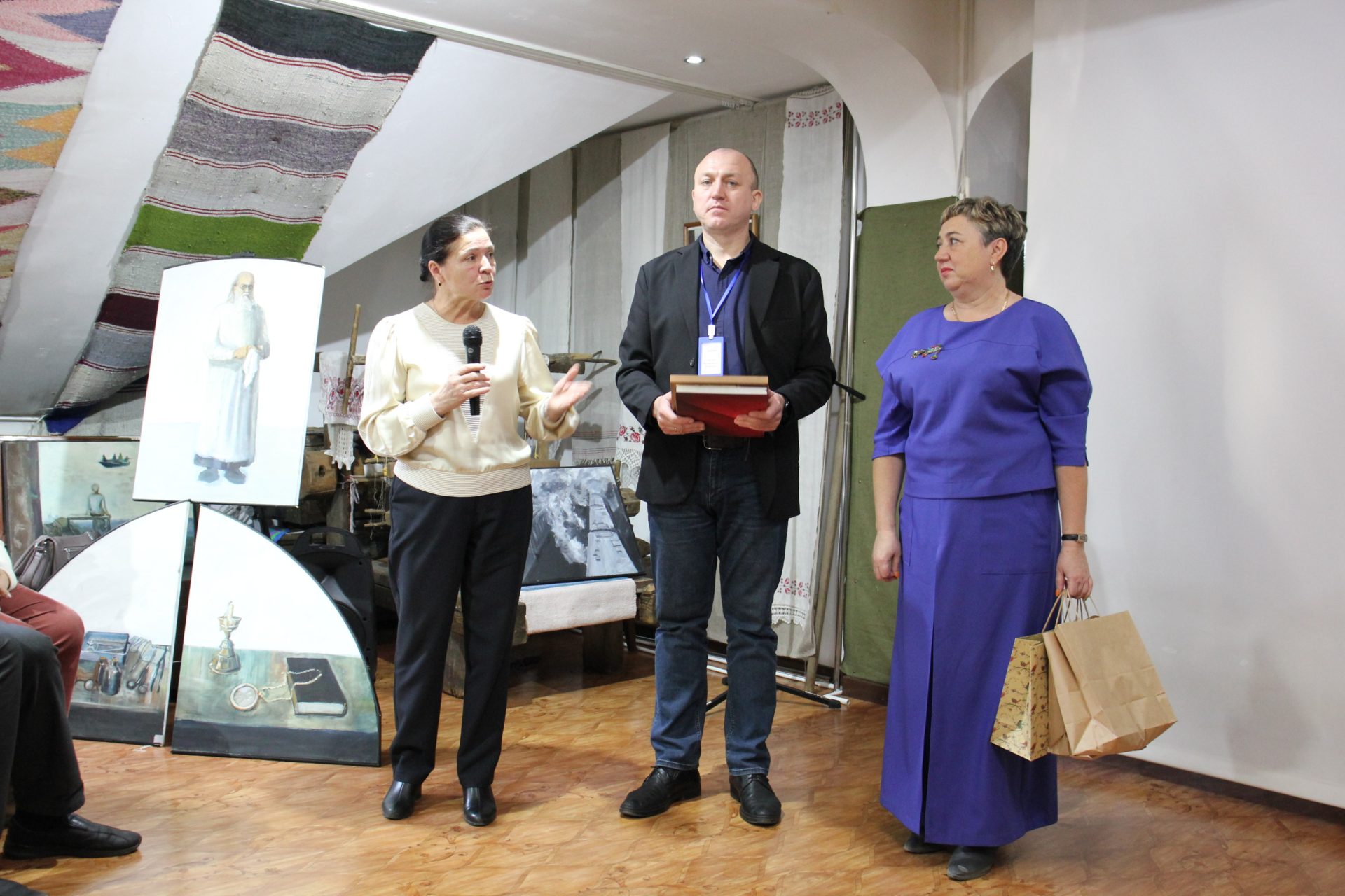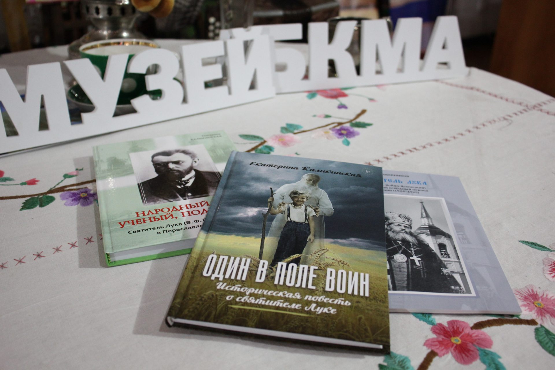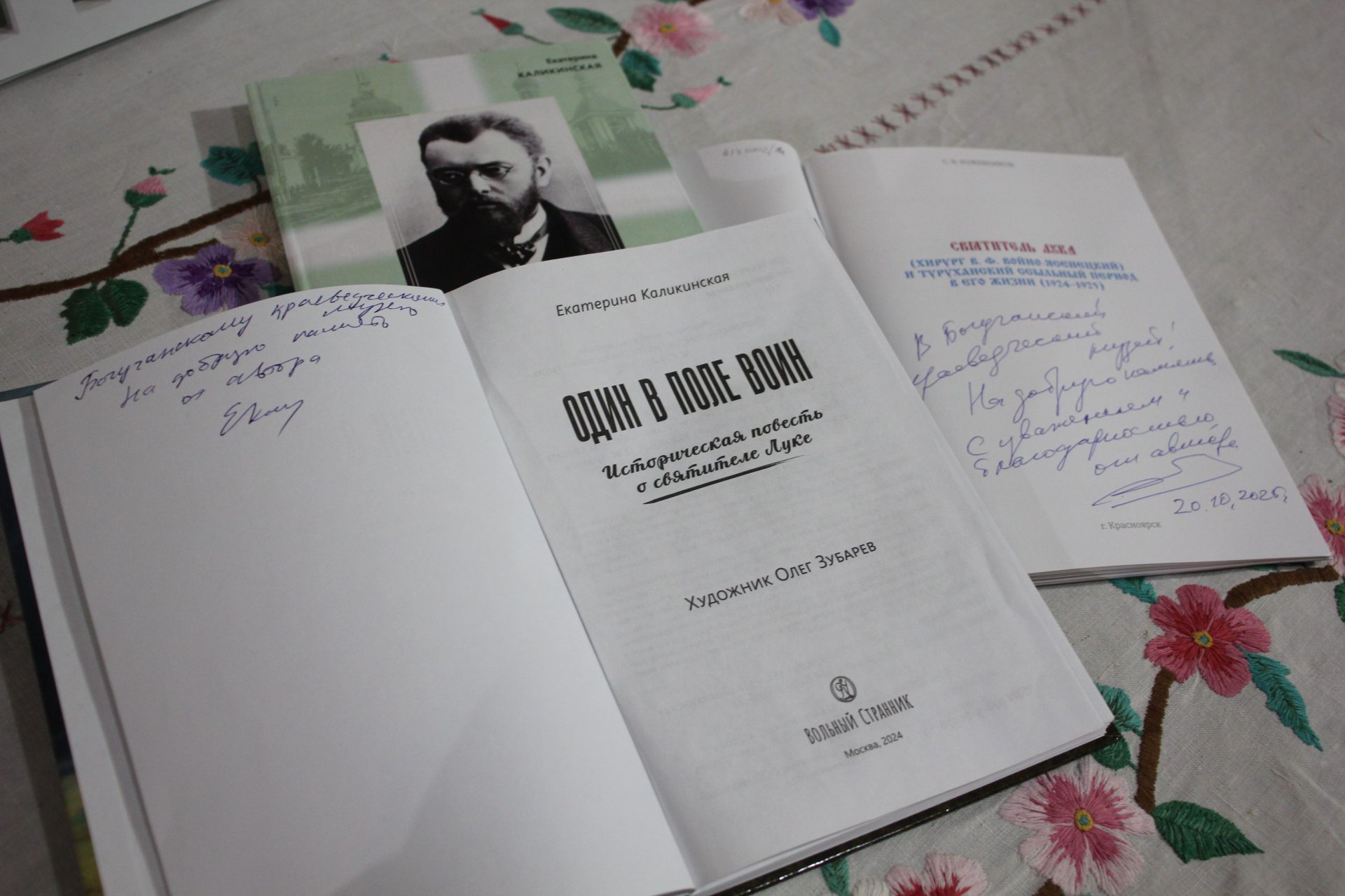 А еще мы с большой радостью сообщаем, что Екатерина Игоревна Каликинская подарила нам картины молодой художницы-сибирячки Анастасии Ситдиковой — выпускницы Санкт-Петербургского университета. Эти картины послужили иллюстрациями к исторической повести о святителе Луке «ОДИН В ПОЛЕ ВОИН». И помимо картин в дар музею были переданы уникальные печатные издания и фотографии. И теперь мы с еще большим энтузиазмом приступили к обновлению постояннодействующей экспозиции «Дом на реке».