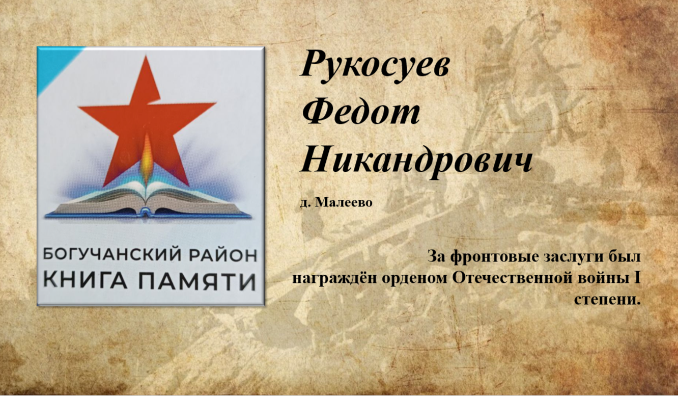 Рукосуев Федот Никандрович, родился 1902 г. в д. Малеево Богучанского района и ушёл на фронт в первые дни войны. Воевал на Ленинградском фронте, перед которым стояла задача прикрыть подступы к Ленинграду и не допустить его захвата противником. Из рассказов фронтовика известно, что с сентября 1941 г. войска Ленинградского фронта вели боевые действия в крайне тяжёлых условиях блокады. В 1944 г. Федот Никандрович был демобилизован по ранению, вернулся в Малеево, где до выхода на заслуженный отдых трудился механиком. Награждён орденом Отечественной войны I степени.