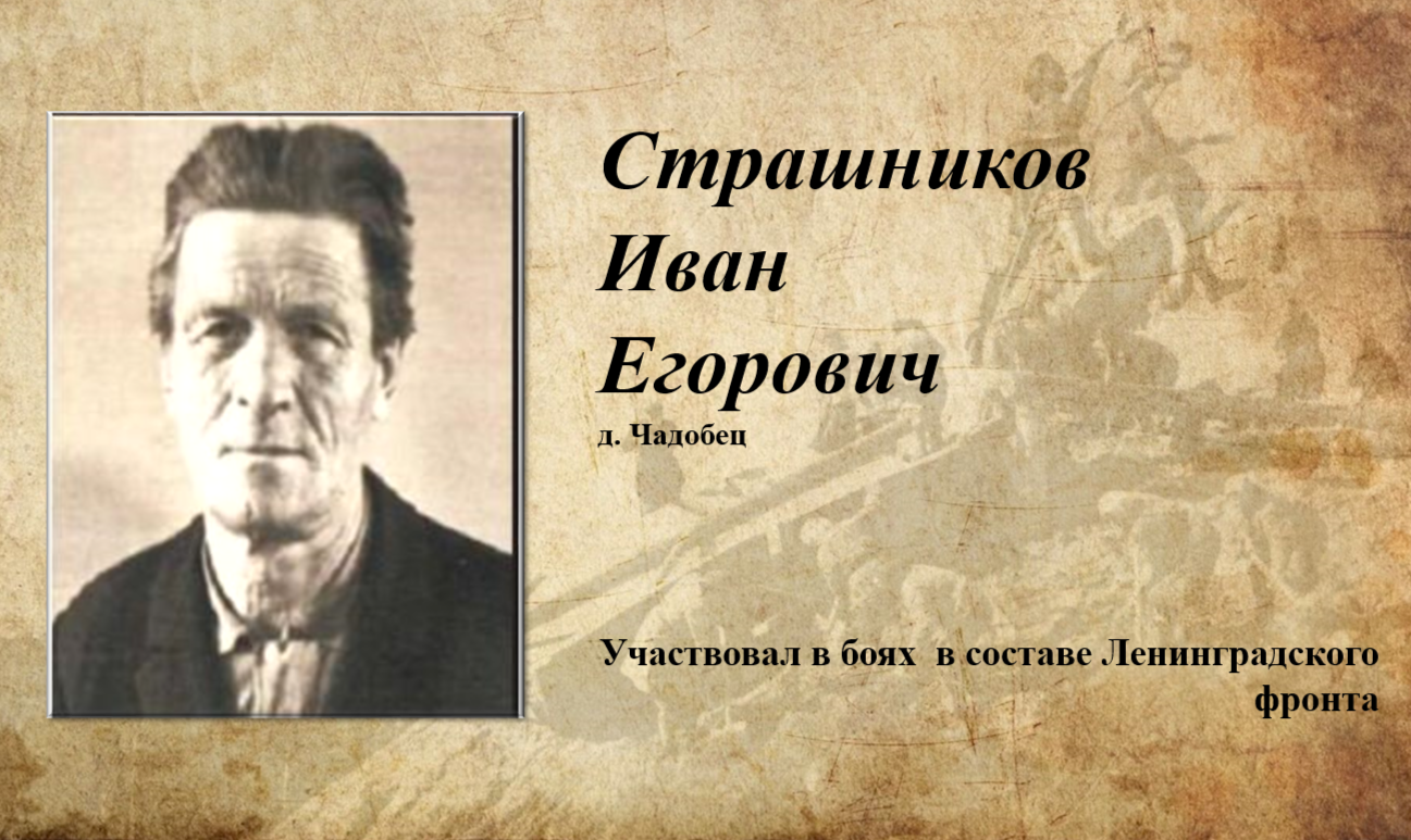 Страшников Иван Егорович, родился д. Чадобец Богучанского района (ныне Кежемский район), в семье колхозников и был единственным ребёнком. До призыва в армию работал киномехаником. Начал службу в батальоне связи 112-го стрелкового корпуса. Из открытых источников известно, что с ноября 1943 г. по май 1945 г.112-й стрелковый корпус участвовал в боях в составе Ленинградского фронта. Дочь фронтовика Елена вспоминает, что отец мало рассказывал про войну. Говорил, ничего не помнит, но, встречаясь с однополчанами, они всегда плакали. Пережитое не давало покоя. Это боль сердца. Каких прекрасных людей тогда теряли! Сколько друзей хоронили в те дни. Все боялись ранения на поле боя, если что, лучше сразу умереть. И всё равно верили, что обязательно, непременно победят».