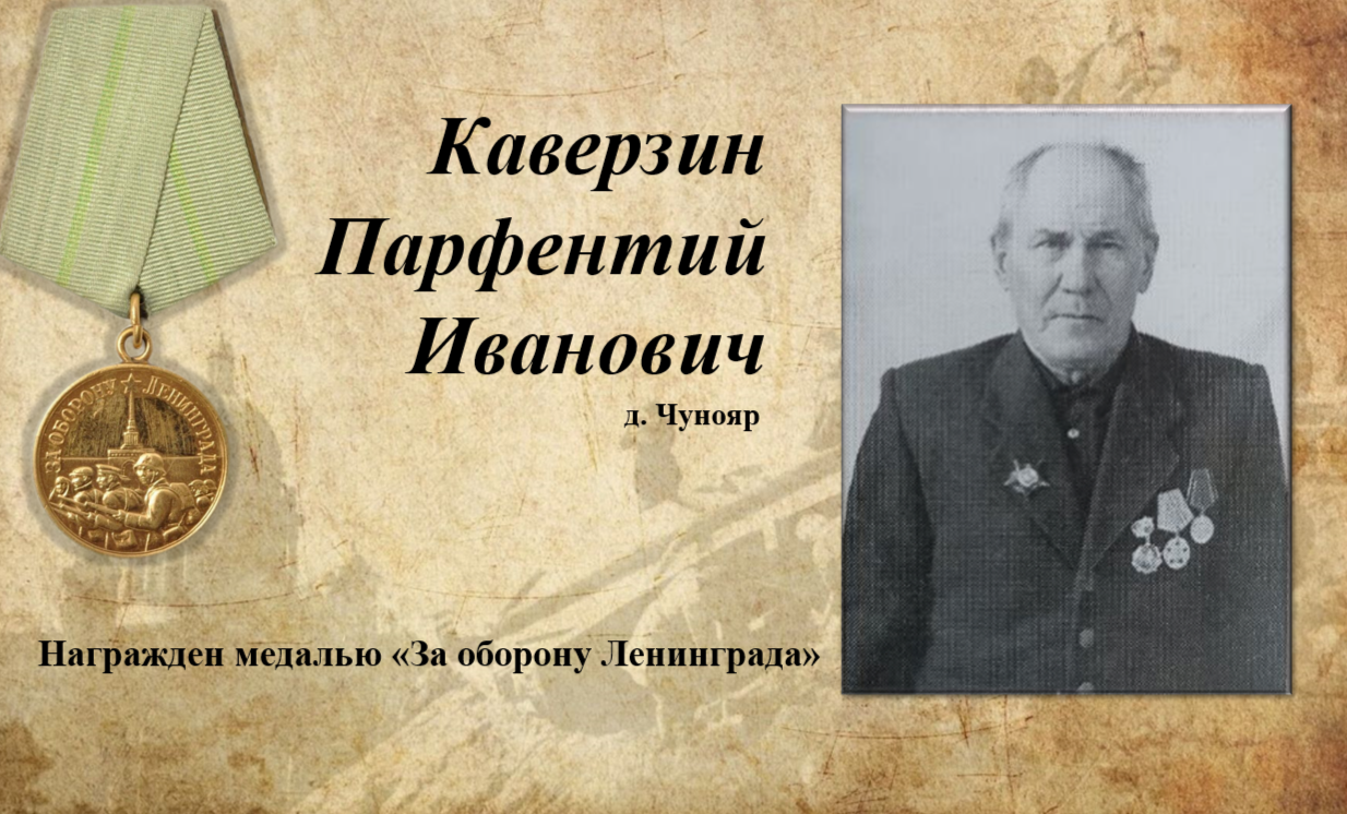 Каверзин Парфентий Иванович – Родился в 1900 г. в д. Чунояр Богучанского района и в 1941 г. был призван на военную службу. Из воспоминаний фронтовика, сохранившихся в Чуноярской библиотеке, известно, что с 1942 г. по 1944 г. его боевой путь проходил на Волховском фронте. По Ладожскому озеру в обозах рядовой Каверзин доставлял провизию, лекарства, необходимые вещи жителям блокадного Ленинграда. Эпизодом из военной биографии фронтовика поделилась его дочь Зинаида: «Был воздушный обстрел. Свистели снаряды, и буквально в 5—7 метрах от обоза упала бомба, но чудом не взорвалась. Отец был неверующим, но в тот момент помолился, перекрестился и мысленно попрощался с семьёй». Парфентий Иванович награждён также медалью «За оборону Ленинграда».