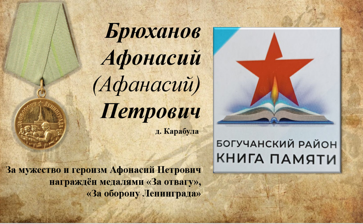 Брюханов Афанасий Петрович – родился в 1908 г. в д. Карабула Богучанского района, откуда 28.08.1941 г. был призван по мобилизации. С июня по ноябрь 1942 г. находился в госпитале по ранению. За годы войны фронтовик был дважды ранен — легко в левую руку и тяжело в правую ногу. После излечения ещё три года служил в артиллерии. За мужество и героизм Афонасий Петрович награждён медалями «За отвагу», «За оборону Ленинграда». 1945 г. Брюханов Афонасий Петрович был демобилизован. Сведений о его дальнейшей судьбе не имеется.