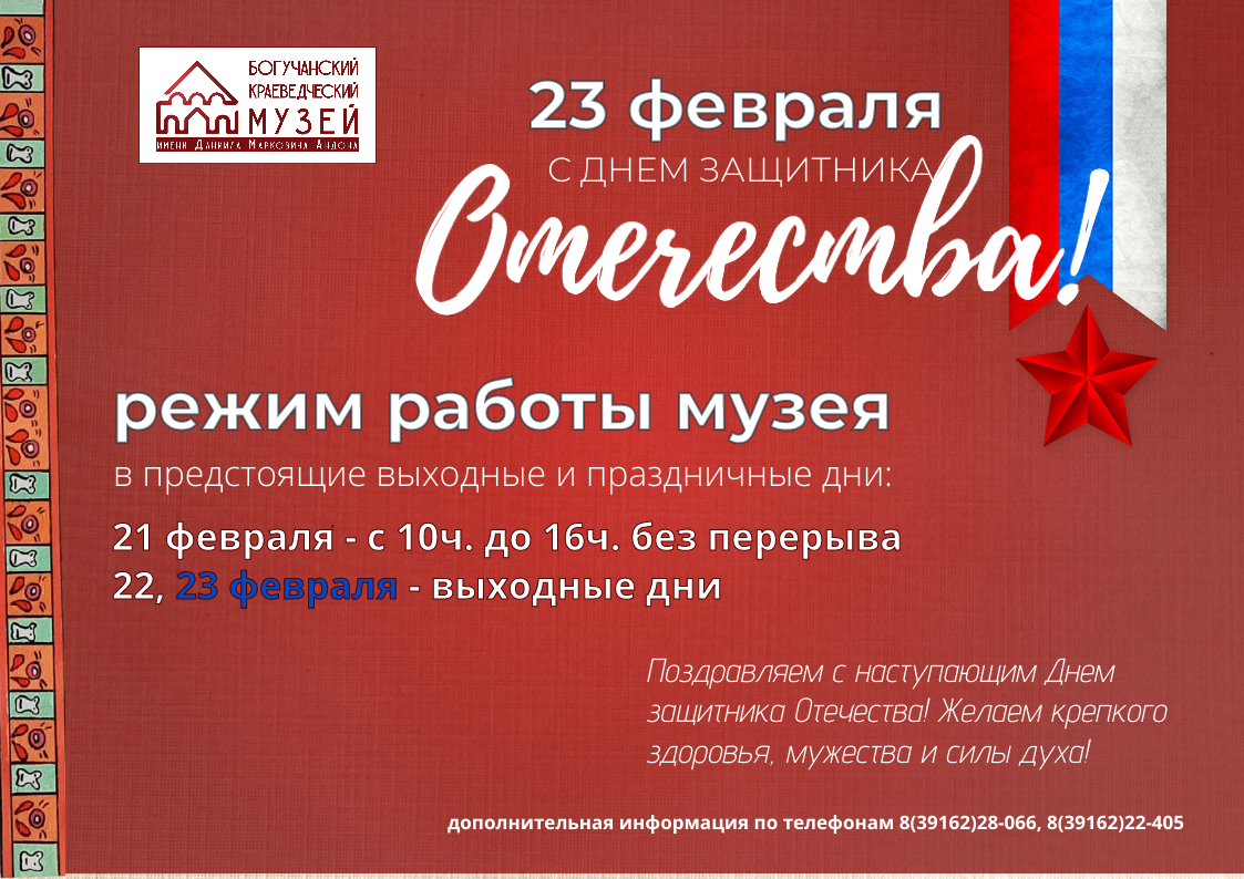 Коллектив Богучанского краеведческого музея имени Д.М. Андона сердечно поздравляет всех причастных с наступающим Днём защитника Отечества – праздником силы, чести и благородства!